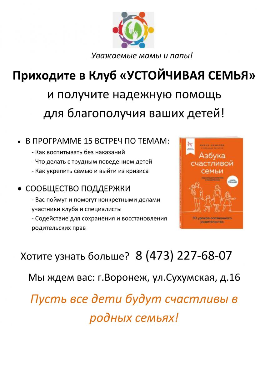 На базе казенного учреждения Воронежской области "Воронежский областной специализированный дом ребенка" , в рамках работы службы "Дети в семье", функционирует клуб "Устойчивая семья", который помогает созданию прочных отношений на ранних этапах развития между родителями и детьми от 0-4 лет. Для занятий в клубе приглашаются родители, имеющие детей от 0-4 лет".