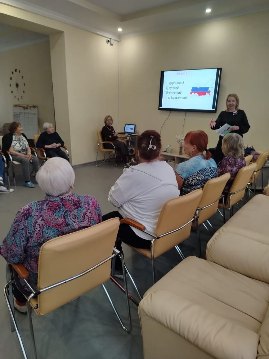 Люди старшего поколения в командных соревнованиях отвечали на вопросы викторины, отгадывали песни о российских городах и даже танцевали национальные танцы: русский, дагестанский и корякский.