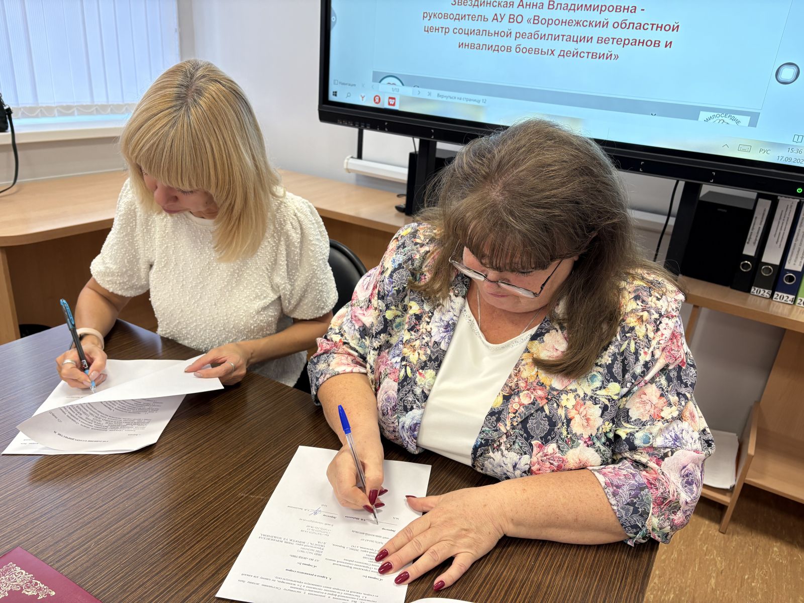 17 сентября 2025 года директор КУВО «Управление социальной защиты населения Советского района г. Воронежа» Любовь Шабанова и руководитель АУ ВО «Воронежский областной центр социальной реабилитации ветеранов и инвалидов боевых действий» Анна Звездинская подписали соглашение о совместной деятельности.